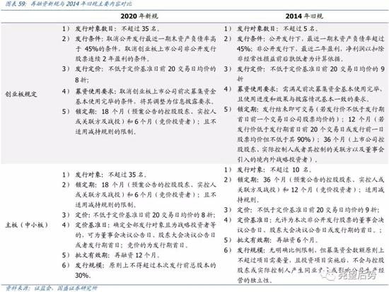 定增放松力度:相较于2014年,定增门槛进一步降低,尤其放松了创业板定增限制,融资需求有望再次爆发。就主板(中小板)而言,新规在发行对象数目、定增折价率、锁定期以及批文有效期方面均实现了适度放松,同时给予战略投资者参与定投更大的选择空间,定价基准日回归2014年多元化的模式,体现了本轮定增放松鼓励战略投资者参与态度。就创业板而言,本次政策力度更为显著,首先定增发行对象数目从5名放宽至35名,盈利要求与负债要求也全面取消,而且定增折价率与锁定期双双下调,创业板主要定增要求相较上一轮大幅放宽,这有望再次激发创业板中小企业的定增需求爆发。
