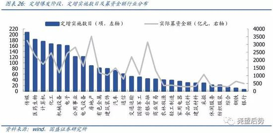定增行业向机械设备、化工和电子倾斜。此阶段定增整体受挫,定增数目向机械设备、化工和电子回归,前三大行业定增实施数目分别为81项、71项、56项。定增融资规模方面,各行业均有所回落,而银行板块再度出现大规模定增计划,定增资金募集规模逼近2000亿元。