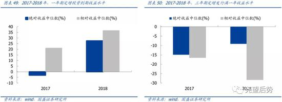 定增紧缩期内,一年期定增收益先降后升,三年期投资回报负收益延续。伴随定增政策收紧,增发难度显著提升,投资收益也显著回落。就绝对收益水平来看,一年期定增投资回报在2017年先快速回落,跌至负收益,随后又在2018年再度回升;而三年期定增投资收益则依旧延续负收益。就相对收益水平来看,一年期定增投资回报继续提升,而三年期投资回报继续回落。