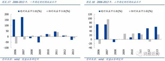定增整体收益前高后低,三年期定增相对收益相对平稳。定增开放早期,两类定增均斩获显著绝对收益,随后定增回报在2008年快速回落。2009至2011年,一年期与三年期定增投资回报逐步回暖。2012年后,一年期投资回报再度回落,三年期投资回报则持续抬升。此外,从相对收益来看,一年期相对收益与绝对收益走势相近,三年期相对收益则表现相对稳健,除2012年外,相对收益在2009-2013年间基本维持在25%左右。