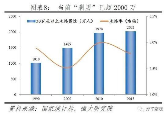 根据2010年人口普查资料,00后男女性别比达119,男性比女性多近1300万;90后男女性别比达110,男性比女性多近900万。1990年中国30岁及以上未婚男性仅略超1000万人,2000年超过1600万,2015年超过2000万。随着1990年以来高性别比的出生人口逐渐进入婚嫁年龄,预计未来“剩男”问题还将更为突出,预计到2040年可能达约4000万。严峻的剩男问题使得“个人困扰”的婚姻挤压问题可能演变为“公共问题”的人口安全问题,包括妇女买卖、性骚扰、性犯罪等。最近几年,越南新娘等现象屡屡见诸报端,正是反映了中国男性面临的严峻婚配形势。