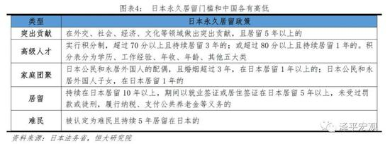 3)在家庭团聚方面,中日各有高低。日本公民和永居外国人的配偶且婚姻超过3年,在日本居留1年以上可申请永居;中国需要婚姻超过5年、居留约4年,中国门槛较高。日本公民和永居外国人子女在日本实际居留1年即可获得永居,中国未满18岁子女可直接投靠中国公民或永居外国人,日本门槛较高。