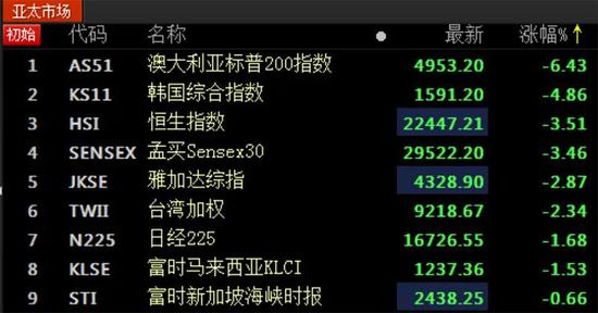 其他亚太市场也大面积受挫。截至发稿,澳大利亚标普200指数重挫6.43%,韩国综合指数下跌4.86%,日经225指数下跌1.68%。