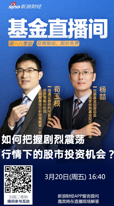 在此市场调整之际,海通证券研究所副所长、首席策略分析师、金麒麟最佳分析师策略第一名荀玉根,同泰基金投资总监杨喆,做客新浪财经客户端,在线直播分享“如何把握剧烈震荡行情下的股市投资机会”,并现场答疑。