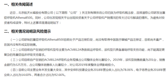 4月8日,航天长峰又发布《关于股票交易异常波动暨风险提示公告》,进一步详细阐述了公司的呼吸机业务。