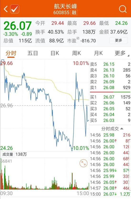 截至收盘,航天长峰股价报26.07元/股,下跌3.30%,全天成交金额37.69亿元,创下该股历史天量,换手率高达40.53%。