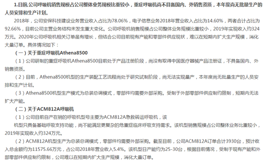 公司方面明确表示:“目前,公司呼吸机销售规模占公司整体业务规模比重较小,重症呼吸机尚不具备国内、外销售资质,本年度尚无批量生产的人员安排和生产计划。”