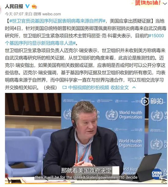 针对美国总统特朗普和美国国务卿蓬佩奥称新冠肺炎病毒来自武汉病毒研究所,世卫组织卫生紧急项目技术主管玛丽亚·范·科霍夫表示,目前约15000个基因序列均显示新冠病毒非人造。