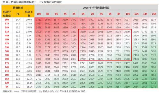 往后三个季度,逐季修复的盈利增速,意味着指数点位可能也是震荡且底部小幅抬升。一方面,由于货币宽松(预计下半年边际收紧),使得估值有一定支撑;另一方面,疫情冲击下盈利的修复进度也存在着不确定性,全年看盈利增速小幅下滑但季度逐季修复。基于这两点,我们对估值和盈利做出情形假设,并进一步测算对应的上证综指点位矩阵图。如下图红色框所示,2020年在盈利-10%至0、估值分位30%至50%的假设下,上证综指的点位多数分布在2600-3000之间(2020年)。