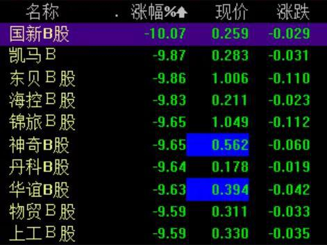 从盘面上看,跌停的个股包括国新B股,凯马B、海控B股等,另有东贝B股、神奇B股等合计近15股跌幅超过9%。整体来看,这些股票都是低价股,股价几乎都在1元以下。
