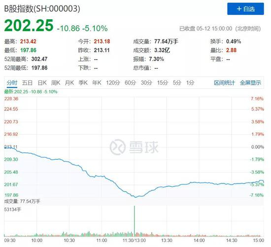 5月12日早间,B股指数低开低走,临近午间跌幅扩大,一度跌逾7%,截至午间休盘,B股指数下跌6.91%,指数报198.38点,创2012年7月以来最低水平。超10只B股跌停,20只B股跌超9%以上。