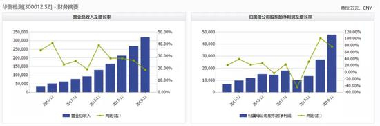 2018年和2019年,华测检测在营收增速同比下滑的同时,归母净利润却得到了高速增长,同比增速分别为101.63%、76.45%。