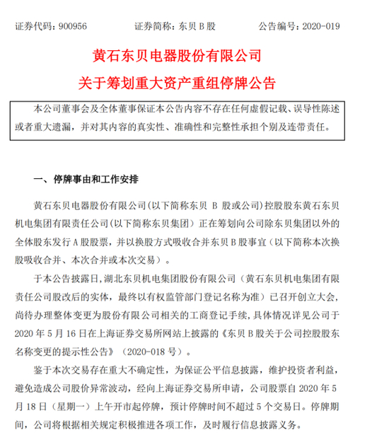 5月15日晚间,东贝B股发布公告称,公司控股股东东贝集团,正在筹划向公司除东贝集团以外的全体股东发行A股股票,并以换股方式吸收合并东贝B股事宜。这也意味着,东贝集团将通过B股改革实现A股市场的整体上市。