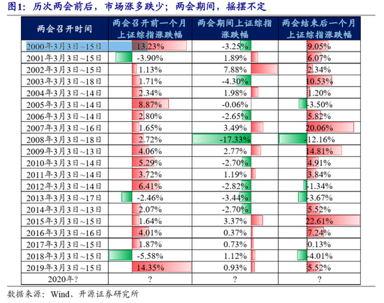 开源证券通过对自2000年以来的历次两会前一个月、两会期间以及两会后一个月的市场表现进行分析,发现历次两会前后市场都是涨多跌少,而两会期间则呈现摇摆不定的特征。