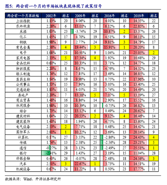 2002年两会前一个月涨幅最好的前五板块是国防军工、电气设备、汽车、有色金属、家用电器,这与当时增收扩大消费、加大农村和西部的基础设施建设投资等政策密切相关;