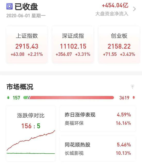 两市共有超过3600家公司上涨,仅157家上市公司下跌,其中涨停156家。