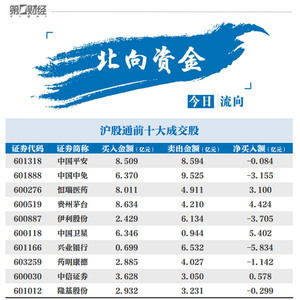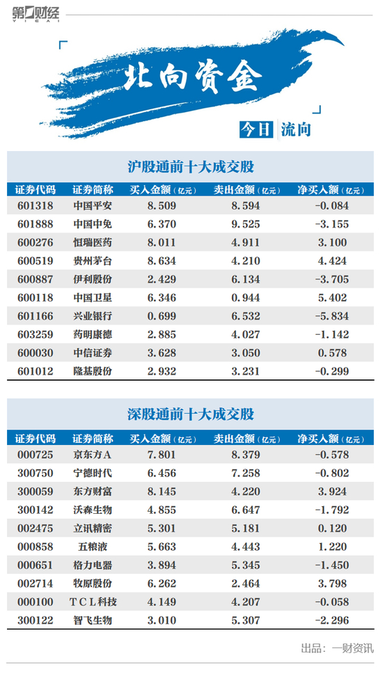 今日前十大成交股中,净买入额居前三的是中国卫星、贵州茅台、东方财富,分别获北向资金净买入5.4亿元、4.42亿元和3.92亿元。