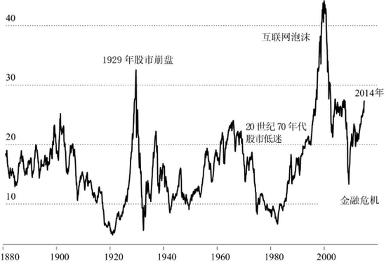 席勒还用强大的数据收集和分析能力,做出了一张股市120年的市盈率变化图(下图)。