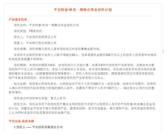 笔者看到文章的第一反应是,投资100万元就可以成为春华基金的 LP?这门槛也未免太低了吧!好奇心使然,笔者在网上搜索到了《平安财富秋实集合资金信托计划推介资料》