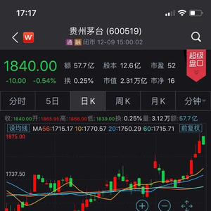 Wind数据显示,截至今日收盘,贵州茅台股价报1840元,PE为52倍。
