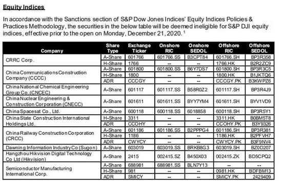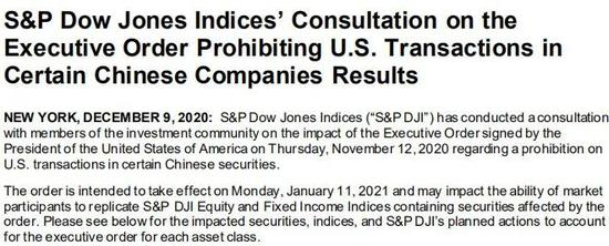 美国时间12月9日,标普道琼斯指数公布了一份中国公司的清单,在美国11月12日禁止美国交易某些中国证券的行政命令发布后,这些公司的股票或者债券证不再符合股票和固定收益指数的要求,将被从相关指数剔除。