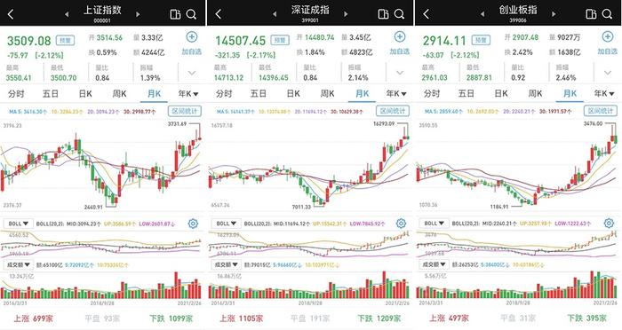 2月惨淡收官,当月沪指涨幅缩至0.75%,深证成指则收跌2.12%,创业板指则暴跌6.86%。至此,创业板指2021年以来下跌了1.73%,上证综指和深证成指跌2021年以来的涨幅分别缩小至1.08%和0.26%。