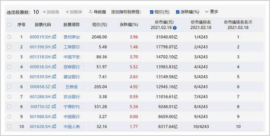 截至2月18日本轮下跌前,A股前十大市值公司中,除了银行和保险之外,新上榜的是高端白酒的代表——贵州茅台和五粮液,以及新能源汽车产业链龙头宁德时代。