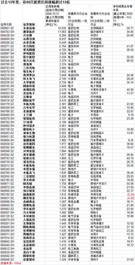 第一财经根据Wind数据统计发现,在过去的13年里,有65只股票区间涨幅超过13倍,占比4.2%,同时,这些也是典型的蓝筹股,或是龙头、或是行业佼佼者。