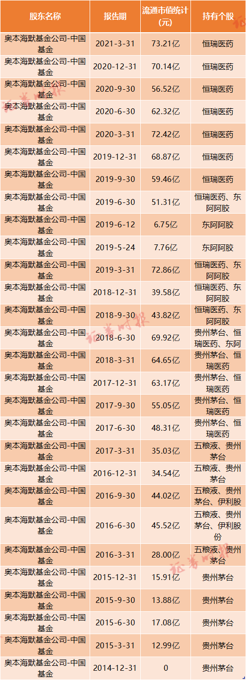 其中,投资贵州茅台最为经典。在2014年获批QFII资格后,奥本海默基金几乎全仓买入贵州茅台。2015年一季度,奥本海默基金出现在贵州茅台十大流通股东,持股市值12.99亿元。直到2018年二季度末,奥本海默基金最后一次出现在贵州茅台的股东名单。期间茅台涨幅接近300%,奥本海默基金获利数十亿。