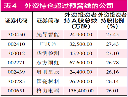 截至今年3月31日的数据,外资在中国股市的持仓占比已经达到5%,随着国内对外资投放额度的进一步放开,以及当前海外经济依然无起色的背景下,长期看多中国已经成为大多数外资的一致选择。截至4月28日,有7家公司的外资合计持股比例已经达到26%的预警线,先导智能、广联达、华测检测甚至逼近28%的外资暂停购买线。