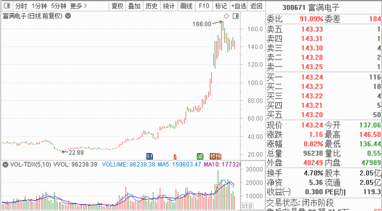 Choice数据显示,富满电子今年以来合计上榜5次,而且是在后期加速阶段上榜的。比如在5月12日的龙虎榜中,机构席位买入4129万,另外一家机构席位买入1228万,同时顶级游资席位财通证券杭州上塘路买入3078万,“杭州帮”买入1370万。而在6月4日的席位中,四家机构席位合计买入11038万,另外顶级游资席位中信证券上海东方路买入2333万;在卖出席位中,两机构合计卖出4052万。到了6月30日,“作手新一”所在席位买入4111万,机构席位买入3322万。