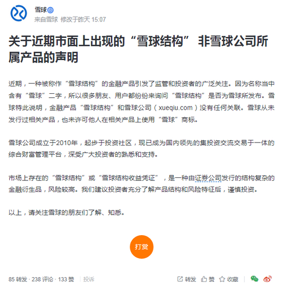 昨日,行家同步发布的平台出现了一则署名雪球的官方公告。大致意思是说,雪球结构产品与之无关。