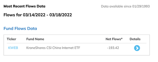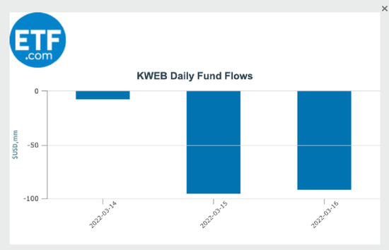 本周KWEB 遭受资金净流出1.93亿美元,超过10亿元人民币。即便是在中概股大涨的3月16日,KWEB仍然遭受了显著的资金净流出。