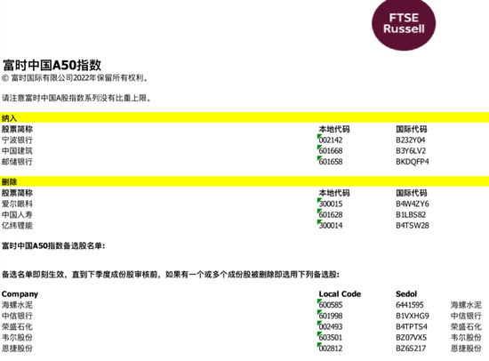 此次,富时中国A50指数方面,新纳入宁波银行、中国建筑和邮储银行,删除爱尔眼科、中国人寿和亿纬锂能。