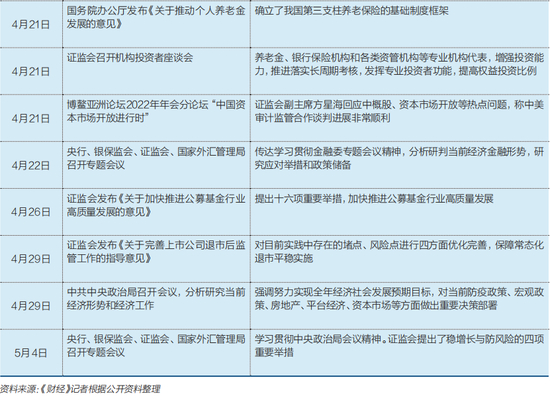 4月26日,证监会发布《关于加快推进公募基金行业高质量发展的意见》,提出支持公募行业差异化发展、壮大公募基金管理人队伍、提高中长期资金占比等16项举措,推进公募基金行业高质量发展。4月29日,证监会发布《关于完善上市公司退市后监管工作的指导意见》,为常态化退市提供保障。