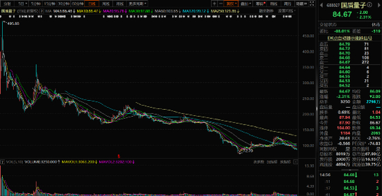 不过,自2020年7月9日在科创板上市以来,在股价上冲至495.88元之后,国盾量子股价就持续下行,目前已经跌到84.67元。