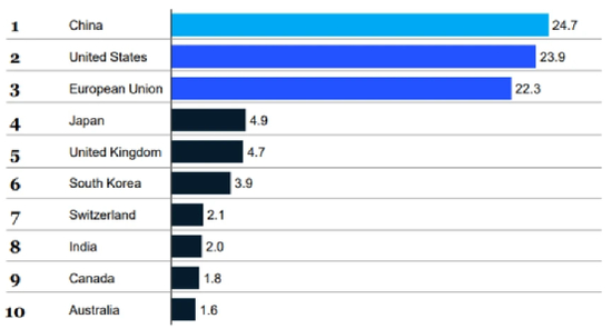 麦肯锡还表示,在研究方面,中国研究机构的科学家发表了最多的文章。中国机构的科学家贡献了近四分之一的量子相关学术出版物;美国和欧盟机构的研究人员位列前三,分别占量子相关出版物贡献的24%和22%。