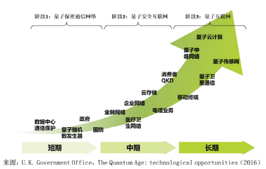而在“量子时代的机会”研究报告中,英国政府描绘了量子通信应用发展趋势,认为量子技术将从量子保密通信网络向量子安全互联网、量子互联网发展演变。