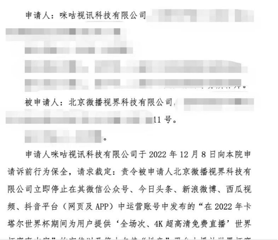 因涉嫌不正当竞争,12月9日,上海市浦东新区人民法院向抖音运营主体公司北京微播视界科技有限公司发出的民事裁定书,要求其立即停止在其“抖音”平台上播放世界杯赛事时使用“超高清4K”标识。申请方咪咕方面称,已就抖音的上述行为于2022年11月15日起持续通过邮件、平台内投诉等方式发送预警函、下线函,要求停止侵权。