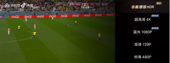 12月9日,浦东新区人民法院发出的民事裁定书当天,世界杯进入1/4决赛阶段,当晚克罗地亚对阵巴西。在抖音的直播中,画质有标清480P、高清720P、蓝光1080P、超高清4K及音画增强HDR等多个选项,均能正常播放。