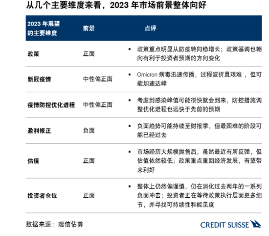 展望未来,瑞信认为,从几个关键维度来看,2023年市场前景整体向好,当前市场反弹已经一定程度上反映了这一预期。因此,投资者可能会转而关注防疫措施优化后的复苏进程,从短期和长期两方面来评估近期政策转向带来的影响。我们看好那些有望受益于防疫措施优化调整的行业,同时也高度关注防疫措施优化效应消退之后的政策接力情况。