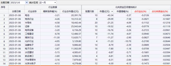在近一个月内,北向资金减持最多的行业排名前五的分别为电池(北向资金区间减持43.34亿元)、物流(北向资金区间减持29.1亿元)、半导体(北向资金区间减持21.25亿元)、证券(北向资金区间减持19.52亿元)、电网设备(北向资金区间减持16.76亿元)。