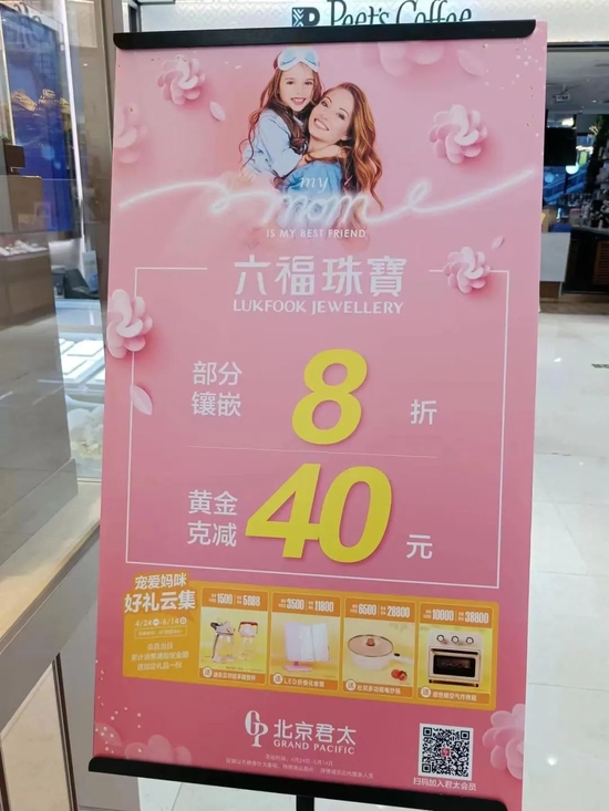 “五一期间购买我们的足金饰品有优惠,5克以上每克可减40元,优惠力度还是比较大的。”北京西城区一家老凤祥门店的工作人员告诉记者。