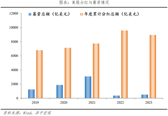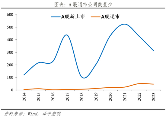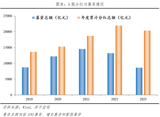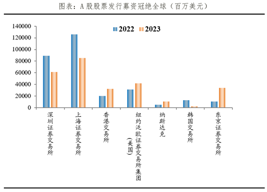 A股股票发行募资冠绝全球。2022-2023年A股融资额连续两年为全球第一。2023年A股IPO数量为313家,而美股为245家,A股IPO募资额约为美股的2倍。A股IPO数量较高,再融资较多,整体节奏较快,对市场存在一定供需失衡。