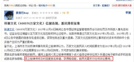 而在社交媒体上,野马财经(微信公号:ymcj8686)也注意到,投资者在遭遇到万家文化收购事件后,这种维权意识也在增强。