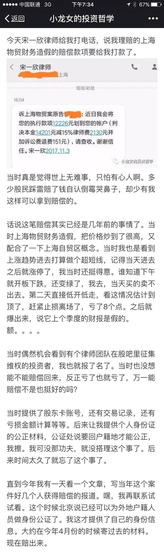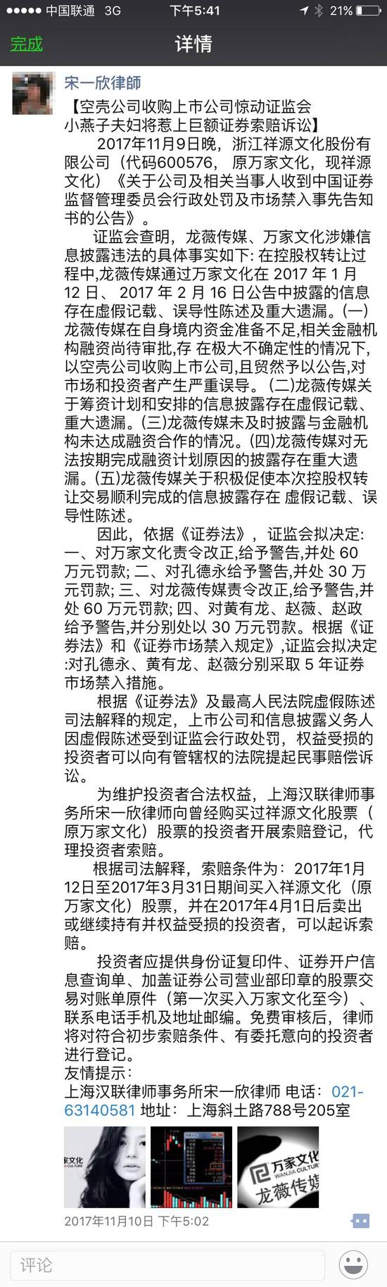 在最后,插播一个投资者小龙女参与这种集体诉讼维权的亲身经历,希望祥源文化利益受损的投资者千万不要怕麻烦,要知道你的维权不仅是为自己讨还公道,也是在为共建一个理性的资本市场出一份力。