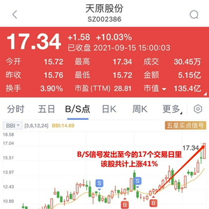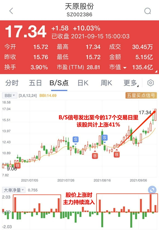 以今日录得涨停的股天原股份为例,通过新浪财经Level-2的大单净量发现,此前,在该股在拉升的同时,B/S点发出关键信号,并伴随着主力资金的天量流入!而近期,B/S点也再度发出机会信号,主力也再度大幅流入该股,该股自B/S点信号发出后的至今的17个交易日里大涨了41%。