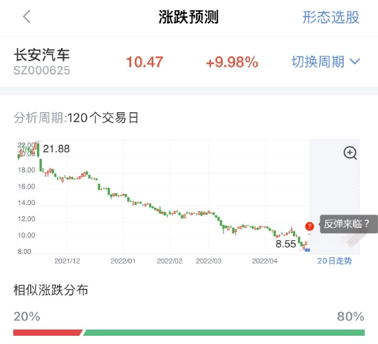 以今日大涨的长安汽车为例,利用新浪财经-形态识金对其现有120天的形态走势,分析了该股未来20天的走势预测,后市能否持续反弹?打开新浪财经-形态识金速来解锁>>未来走势也就不再成迷!