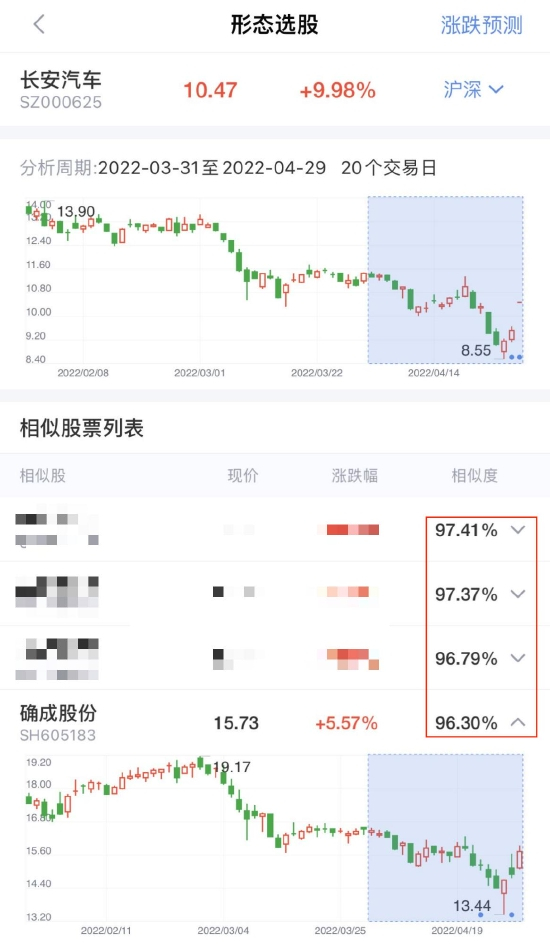 而第一名神秘个股相似度更是接近95%!那么,也就意味着,这只神秘个股更有可能复制长安汽车的反弹势头!