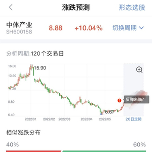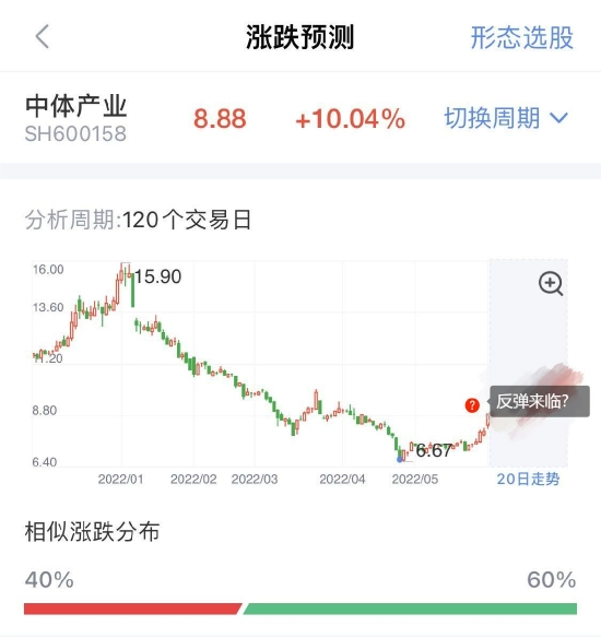 以今日大涨的中体产业为例,利用新浪财经-形态识金对其现有120天的形态走势,分析了该股未来20天的走势预测,后市能否持续反弹?打开新浪财经-形态识金速来解锁>>未来走势也就不再成迷!